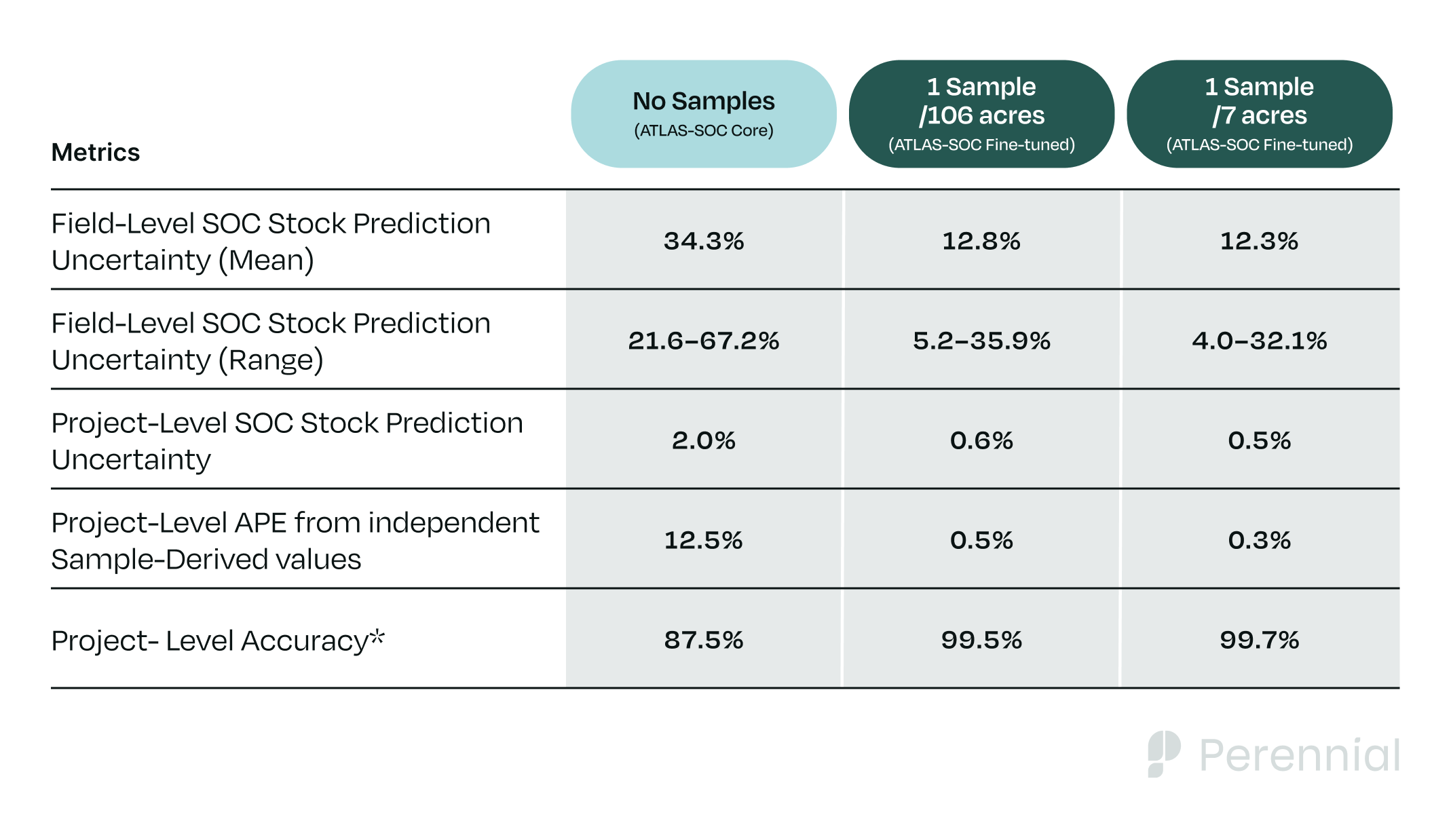 These validation studies demonstrate how Perennial’s digital soil mapping model can meet stringent accuracy requirements and achieve low uncertainty without intensive field sampling.